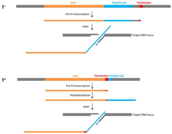 A long poly(A) tail (A>20) in SINE transcripts is strictly required for retrotransposition mediated by L1 reverse transcriptase [46]. This process has been well documented for human Alu, which is a T− SINE. The proposed model of Alu retrotransposition was confirmed by experimental and bioinformatics data [3,19,47,48,49]. The human genome contains a relatively small number of young Alu copies with long poly(A) tails. Pol III processes the entire sequence of such Alu copies, including the poly(A) tail, and transcription terminates at random terminators in the downstream sequence (Figure 1). It should be noted that subsequent retrotransposition can be efficient only if the terminator is close (<40 bp) to the poly(A) tail [19]. The L1-encoded ORF2 protein cleaves genomic DNA at 3′-AA↓TTTT−5′ site, and the TTTT binds the poly(A) tail of Alu RNA and serves as the primer for reverse transcription carried out by the same ORF2 protein (Figure 1). This process called target-primed reverse transcription (TPRT) gives rise to an Alu copy at the new genomic location.
