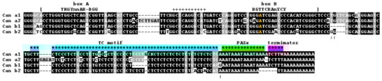 All Can subfamilies have a long (45–60 bp) polypyrimidine motif consisting mainly of T and C residues (referred to as TC-motif hereafter). As shown below (Section 3.6), the TC-motif is critical for the polyadenylation of Can transcripts synthesized by pol III. The tRNA-derived region and the TC-motif are spaced by a short region, 21 bp in Can_a and 16 or 18 bp in Can_b. This distance in other SINEs with a TC-motif is much longer, e.g., 62 and 76 bp in Ves and Dip, respectively [50].