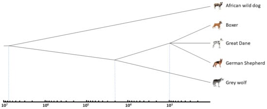 The evolutionary relationships and divergence times of the African wild dog (Lycaon pictus), grey wolf (Canis lupus) and modern dog breeds. Time is shown on a logarithmic scale. See the text and Table 2 for other explanations and references.