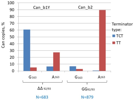 We analyzed the distribution of German Shepherd copies missing in the wolf genome between the Can subfamilies, i.e., recent copies that emerged after dog domestication in the last 20,000 years [70]. The majority of copies belong to the Can_b2 subfamily and as low as 5–7% could be assigned to Can_b1; no Can_a1 and a2 were found. It should be noted that Can_b1 and b2 sequences are not always easy to discern and we used the GG insertion at positions 92/93 in Can_b2 as the distinctive character (Figure 2). An analysis of young Can_b1 copies (Can_b1Y) demonstrated that most of them had G at position 163 and TCT terminators similar to Can_b1 (Figure 4). Thus, Can_b1Y is a small particular group of Can_b1 that is still retrotranspositionally active in dog genomes. Conceivably, the Can_b2 subfamily evolved from Can_b1 via an intermediate such as Can_b1Y.
