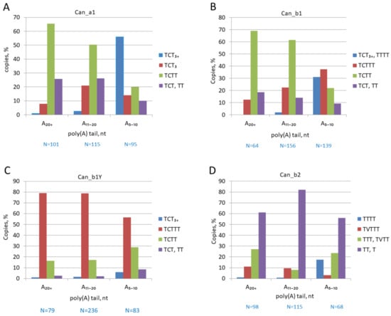 Distribution of pol III terminators or their rudiments among Can copies with poly(A) tails of different lengths. (A) Can_a1 subfamily; (B) Can_b1 subfamily; (C) Can_b1Y, young b1 copies; (D) Can_b2 subfamily. The number of analyzed Can copies is indicated below as N = number. V in terminator sequences corresponds to C, A, or G.