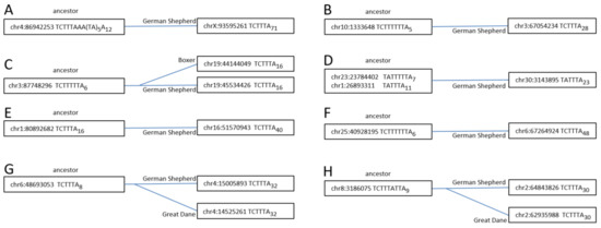 These data agree with the recent comparison of the Great Dane and German Shepherd genomes by Halo et al. [69]. Table 2 also presents similar comparison data for the genomes of the grey wolf and the same three dog breeds. In all cases, the number of wolf-specific Can copies ranged from 7856 to 14,109 between the dog genomes; i.e., it was only marginally larger than the number of specific dog-vs.-dog Can copies.
