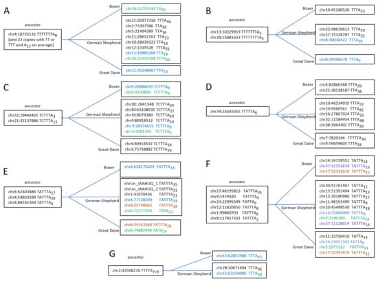 Examples of Can_b2 copies (A–G) illustrating their retrotransposition via T+ mechanism. The left coordinate, terminator structure, and poly(A) tail length are specified. The left (“ancestor”) boxes include copies present in the genomes of the German Shepherd, Great Dane, and Boxer; the right boxes include daughter copies present in one or two dog breeds (copies found in two breeds are given in the same color).