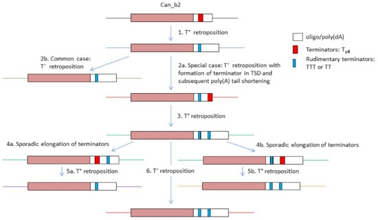 Figure 8 illustrates the emergence of copies with two functional or rudimentary terminators as well as a sporadic loss of one of them in Can_b2 copies within a tribe. The most common Can_b2 terminators composed of Ts shorten after transcription and retrotransposition with high probability, which makes them nonfunctional (event 1 in Figure 8). In particular cases, a new terminator can emerge at the end of a Can_b2 copy within a TSD (event 2a). After T+ retrotransposition, such a new terminator will likely shorten to give rise to a copy with two rudimentary terminators (event 3). SINE copies are passed through numerous host generations, and sometimes the terminators spontaneously elongate (Figure 5D and Vassetzky et al., 2021 [50]). This can restore the function of the first or second terminator in Can_b2 (events 4a and 4b). After transcription termination at the first or second terminator, the emerging SINE copies can have one or two terminators, respectively (events 5a and 5b). This diagram illustrates the diversity of 3’-terminal sequences in closely related tribe sequences as well as a possible alternation of T+ and T− retrotransposition in these copies. It is not improbable that the presence of two terminators can somewhat compensate for the high incidence of their shortening after T+ retrotransposition. The capacity for T+ retrotransposition in certain copies can be advantageous for tribe expansion since the resulting copies have long poly(A) tails, which consequently favor their T− retrotransposition.