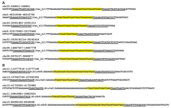 Examples of A-tails of SINEs with TA3–5 repeats (shown in yellow) and flanking sequences containing TSDs (underlined). (A) Can_b2; (B) Alu. Notice that TSDs start with TA3–5. The SINE coordinates in the German Shepherd and human genomes are given above sequences.