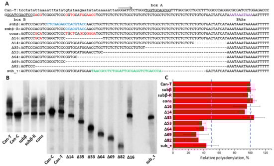 Our previous experiments on cell transfection with a plasmid containing a Can copy demonstrated that its RNA transcribed by pol III can be polyadenylated in an AAUAAA-dependent manner [45]. Here, we tried to identify regions other than AATAAA but that are also essential for the transcript polyadenylation in the same Can copy. By analogy to previously studied T+ SINEs (B2, Dip and Ves), such regions could contain the β and τ signals downstream of the box B and upstream of (AATAAA)n, respectively [43,45]. The Can copy studied belongs to the Can_a1 subfamily, although its sequence naturally was not identical to the consensus sequence. A series of constructs were generated based on this copy with nucleotide substitutions and/or deletions; these constructs were used to transfect HeLa cells and the cellular RNA was analyzed by Northern hybridization with the Can-specific probe. We presumed that modifications within the putative β-signal that make it identical to the Can_a1 consensus sequence can increase the polyadenylation efficiency; however, it was not observed (Figure 10, cons). A long deletion (Δ16) or multiple nucleotide substitutions (subβ and subβ_R) in this region downstream of the box B scarcely decreased the polyadenylation rate (Figure 10). These data indicate the absence of β-signal in Can SINE. Testing a series of constructs with deletions that started immediately upstream of the PAS and proceeded to the Can head demonstrated a significant drop in polyadenylation efficiency only when the entire TC-motif was deleted (Figure 10, Δ53). Longer deletions (Δ64, Δ69, and Δ82) had no further effect on the polyadenylation efficiency. The deletion of 19 bp in the TC-motif together with the replacement of the rest 30 nt of the motif with a random sequence (sub_τ construct) also substantially decreased its polyadenylation efficiency (Figure 10). Thus, the TC-motif has the τ-signal function in Can. Previously, we demonstrated the same function for polypyrimidine motifs in Dip and Ves transcripts [45]; however, in contrast to these SINEs, Can lacks the β signal. This can be attributed to the short distance between box B and TC-motif (Figure 2 and Figure 10). From all appearances, Can is the shortest and simplest of known T+ SINEs.
