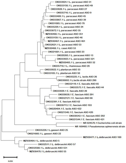 Phylogenetic analysis of the obtained sequences confirmed the same results in terms of the evolutionary relationship among the strains. From the phylogenetic tree (Figure 1), it can be inferred that there was a clear similarity among the different species of Lactobacillus, Lacticaseibacillus, and Lactococcus except for L. delbrueckii and L. gasseri that diverged in different clades. The species of Enterococcus spp. were clustered together, revealing close similarities.