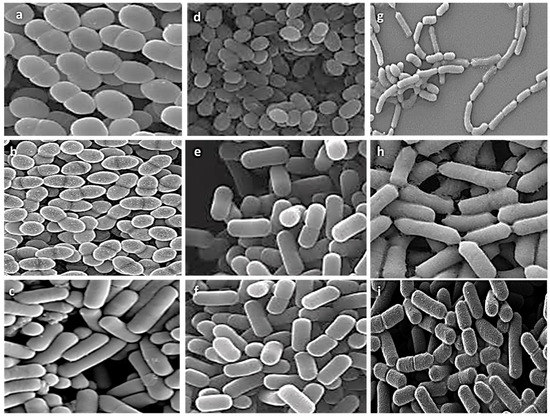 Scanning electron microscopy visualization of different isolates, (a) E. faecalis ASO44; (b) E. faecium ASO292; (c) L. delbrueckii ASO100; (d) L. lactis ASO26; (e) L. plantarum ASO50; (f) L. case ASO53; (g) L. rhamnosus ASO20; (h) L. gasseri ASO25 (i) L. paracasei ASO32. Images were captured at an excitation voltage of 20 K.V., at 5000 magnification with a working distance of 13.7–14.2 mm.