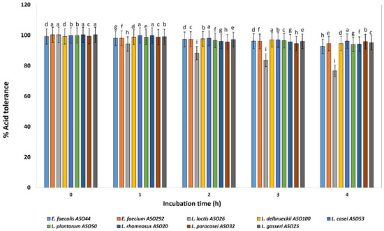 Percentage of acid tolerance of the isolated lactic acid bacteria during different incubation times of 0, 1, 2, 3 and 4 h. LAB isolates were grown on pH 3.0 for 4 h, and percentages of tolerance were estimated by counting viable bacterial counts which tolerated the acidic medium with relative to neutral pH conditions (pH 6.4). a–i Estimates with the same letters are not significantly different (p > 0.05) among different isolates for the same incubation time.