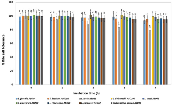 One of the major requirements for probiotic selection is the ability to survive and grow in the GIT, so they should be able to tolerate the intestinal bile salt. Probiotic physiological alterations, including exopolysaccharide synthesis and carbohydrate fermentation, are related to the resistance to elevated bile salts [56]. The adaptation of probiotics to bile salts is also connected to the structure of membrane proteins and fatty acids as well as the prevention of pathogen adherence to human mucus [57,58]. To compete with pathogens when employed in functional foods, probiotic strains must possess resistance to bile salts. Tolerance of an average level of 0.3% of the bile salt has been estimated in many studies for potential probiotic LAB candidates [59]. Interestingly, our results estimated that, except for the L. lactis ASO 26, all the LAB isolates in this study exhibited tolerance to 0.5% bile salts for a 4 h incubation period.