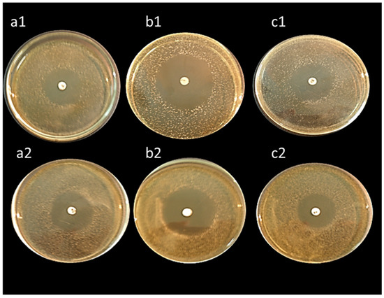 Antibacterial activity of cell-free supernatants of L. delbrueckii ASO100 (upper three plates) and L. rhamnosus ASO20 (lower three plates) against Bacillus subtilis (a1,a2), Staphylococcus aureus (b1,b2), and Escherichia coli (c1,c2). The plates were firstly inoculated with the tested pathogenic bacteria, then allowed to air dry for 15 min; discs impregnated with cell-free supernatants were spotted on the middle of the plates. Diameters of the formed inhibition zones were measured after incubation at 37 °C for 24 h.