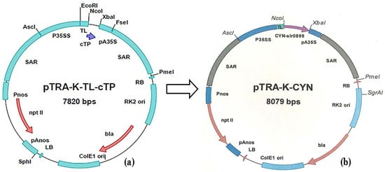 The plant expression vector, pTRA-K-CYN, was first transformed into competent Agrobacterium tumefaciens by the heat shock method. Then, the positive clones were determined using a PCR colony test (Figure 4).