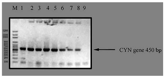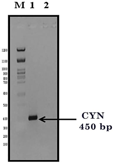 PCR product of the CYN amplification (450 bp). M: 100 bps DNA ladder, Lane 1: amplified CYN gene fragment, Lane 2: negative PCR control.