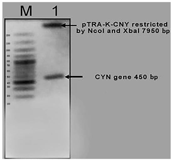 Plasmid DNA was isolated from the overnight culture of transformed DH5α, and was then restricted with NcoI and XbaI restriction enzymes. Aliquots of the restricted samples were visualized in a 1% (w/v) agarose gel containing ethidium bromide. The obtained result of the isolated plasmid indicates the generation of the right pTRA- K-CYN clones (450 bp + 7950 bp) (Figure 3).