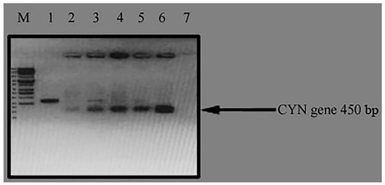 Wild-type C. reinhardtii alga was transformed with the expression plasmid, pTRA-K-CYN, using a positive clone of Agrobacterium tumefaciens by the heat shock method. Two days after C. reinhardtii transformation, the cells were harvested. The selection of transgenic lines was performed on the DNA level using a colony PCR test for positive algae using specific primers for CYN transgenes against the negative control. The results of the colony PCR test declared the presence of seven different transgenic C. reinhardtii lines for the CYN gene (Figure 5). Three independent lines (2, 4, and 5; Figure 6) were randomly selected and named TC. reinhardtii-1, TC. reinhardtii-2, and TC. reinhardtii-3. They were used for quantitative real-time PCR analysis.