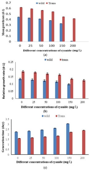The growth parameter results revealed that there was an inverse relationship between the increase in potassium cyanide concentration and the mean growth rate, relative growth rate, and generation time of both wild and transgenic lines, but the transgenic line showed a better resistance and growth frequency in the presence of different potassium cyanide concentrations, as compared to the wild type (Figure 7a–c).
