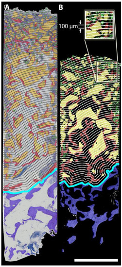 41.4% (n = 29) of the sections were stained with Levai-Laczko dye [27] and digitised with a camera mounted on a microscope (Nikon DXM1200/Microphot-FXA, Tokyo, Japan). Multiple single images per specimen were merged into high-resolution overview images (2.212 µm per pixel) (Lucia G 4.71, LIM., Praha, Czech Republic). The remaining 58.6% of the sections (n = 41) were scanned using an SEM (JSM-6310, Jeol, Tokyo, Japan) with back-scattered electrons at 15/20 kV and a resolution of 2.695 µm per pixel. The comparability of the results of the SEM and the histological image sources had previously been verified by the intraclass correlation coefficient within 10 biopsy specimens (≥0.92) [25].