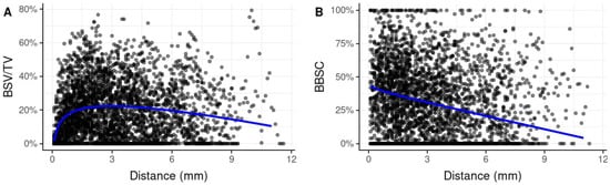 Mean BSV/TV within the entire AA was 19.2% (SD 16.4) (Table 1). A closer look at the spatial distribution of BSV/TV within the AA reveals a marked increase of BSV/TV within the first 1.5 mm adjacent to the SF and a subsequent steady decline (Figure 2A). In immediate proximity to the SF (within a distance of 0.1 mm to the SF) expected BSV/TV was very low (1.7%). At a distance of approximately 3 mm from the SF, it reached a maximum of 22.3% before it steadily decreased to 19.6% at 6 mm and 14.5% at 9 mm (Table 2). Both the logarithmic increase of BSV/TV (most evident within the first 1.5 mm) and the linear decrease were statistically significant (p < 0.001).