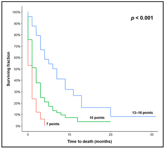 Kaplan–Meier curves for survival of the three prognostic groups (7, 10, and 13–16 points). p-value was calculated using the log-rank test.