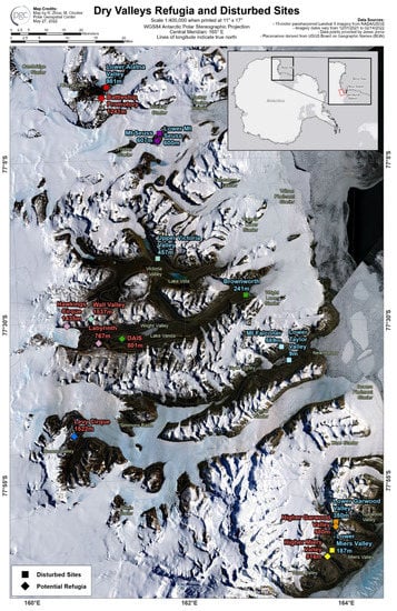 - Fountain, A.G.; Levy, J.S.; Gooseff, M.N.; Van Horn, D. The McMurdo Dry Valleys: A landscape on the threshold of change. Geomorphology 2014, 225, 25–35. [Google Scholar] [CrossRef]