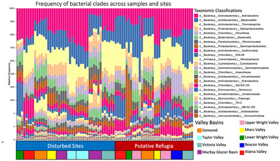 Frequency of bacterial and archaeal clades across samples. Relative frequency of ASVs in each sample is displayed at the class level; the vertical axis shows the proportion of total ASVs in each sample for each class. The horizontal axis is coloured to show if a sample originated from a site characterized as a disturbed site or putative refugia. Colors represent the valley basin of sample origin.