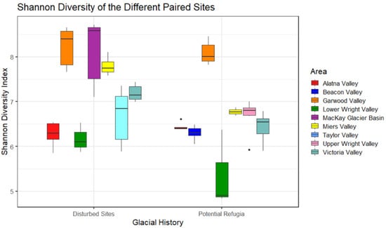 While microbial community diversity was initially hypothesized to be higher in refugia, comparable to high population genetic diversity in refugia found among other terrestrial organisms [15,44], our findings present the opposite result. Shannon diversity indices were significantly lower in putative refugia sites than in more recently disturbed sites in this study, while differences between the valley basins were more pronounced than between disturbed sites and putative refugia. None of the individual comparisons showed higher diversity in the putative refugia site compared to a recently disturbed site in the same valley basin, except in Miers and Victoria Valley.