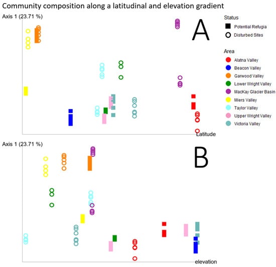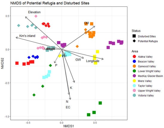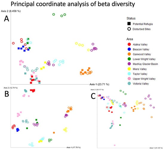Given that our sampling sites were uniformly chosen for habitable soil, that is, signs of periodic wetting and limited salt accumulation, geochemical factors normally used as a proxy for soil exposure age—sulfate, nitrate, and chloride concentrations– were not used to categorize sites in this study [23,24,25,26]. The initial classification of putative refugia or disturbed site status mainly relied on published exposure age estimates (Table 1). Putative refugia sites were identified in all sampled valley basins except the McKay Glacier Basin and Taylor Valley, while disturbed sites were located in all valley basins except the Beacon and Wright Valleys. Putative refugia sites were located at elevations ranging from 646 m (Miers Valley) to 1522 m (Beacon Valley), while disturbed sites were generally located at much lower elevations ranging from 9 m (Taylor Valley) to 873 m (McKay Glacier Basin) above sea level.