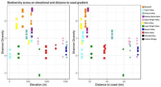 Biodiversity across an elevational and distance to coast gradient. Each individual sample replicates’ Shannon diversity is displayed in relation to the location’s elevation (left) and distance to coast (right). Diamond shaped points indicate putative refugia and squares indicate disturbed sites, while colors indicate the valley basin of sample origin.