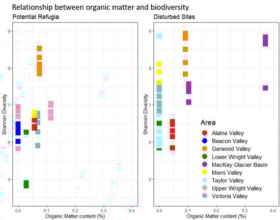 Relationship between organic matter and biodiversity. Individual sample replicates’ Shannon diversity is displayed in relation to the location’s organic matter content. Replicates from the same site share the same organic matter content. Putative refugia sites and disturbed sites are displayed separately. Colors indicate valley basin of sample origin.
