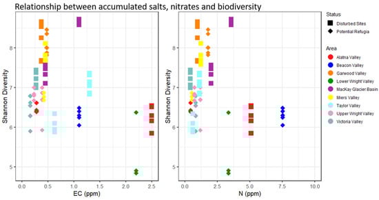 Relationship between accumulated salts (electrical conductivity), nitrate and biodiversity. Individual sample replicates Shannon diversity is displayed in relation to the location’s salt (left) and nitrate (right) content. Replicates from the same site share the same concentration of salt and nitrate. Diamond-shaped points indicate putative refugia, squares indicate disturbed sites. Colors indicate valley basin of sample origin.