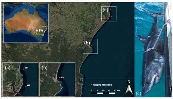 Location of tagging sites (red dots) on the northern New South Wales coast of eastern Australia. (a) Lennox Head, tagging site of white shark 1 (W1) and Ballina, tagging site of white shark 2 (W2), (b) Evans Heads, tagging site of white shark 3 (W3), and (c) W1 secured to the side of the vessel during tagging procedure (image provided by the New South Wales Department of Primary Industries). Map generated in QGIS.