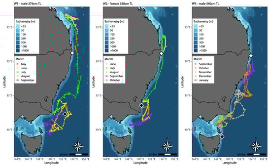 Track reconstruction of three white sharks (C. carcharias) tagged off the northern New South Wales coast of eastern Australia. Estimated track positions are colour-coded by month. Tagging locations indicated by white diamonds, and MiniPAT tag pop-up locations indicated by black diamonds. Maps were generated in R Statistical Software, version 4.1.0 [29], using R packages ‘marmap’ and ‘ggplot2’ [32,33].
