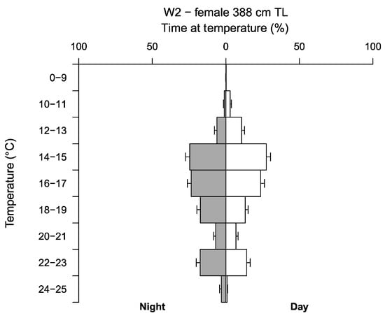 TAD and TAT data recorded by W2, reveal a clear relationship between water temperature and depth, recording higher temperatures in surface waters, and lower temperatures with increasing depths (Figure 4b and Figure 5). Welch’s two sample t-test revealed W2 spent significantly more time in lower temperatures during daylight hours and higher temperatures at night with mean temperatures (±SE) 16.23 ± 0.002 °C and 17.27 ± 0.002 °C, respectively (t = −289.5, df = 3425332, p ≤ 0.05) (Figure 5). Water temperatures occupied by W2 ranged from 7.70 to 24.05 °C (mean 16.79 ± 0.002 °C), with a clear preference for temperatures between 14 to 19 °C, spending ~65% of the time in this range during the day and at night. Outside of this range, W2 favoured temperatures between 22 to 23 °C, spending ~14% and ~18% of the time in this range during the day and at night, respectively. Temperatures below <12 °C were rarely occupied, with a minimum temperature of 7.70 °C recorded during W2’s deepest dive of 644.50 m.
