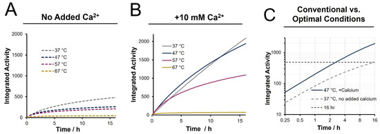 Cumulative activity across a 16 h time course estimated from integrated activity over time (A) in the absence of calcium, (B) with 10 mM added calcium ions, and (C) comparing the proposed optimal condition of 47 °C with 10 mM calcium ions to conventional conditions.