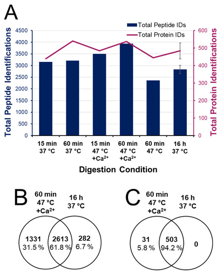 Figure 4 provides a summary of total peptide and protein identifications from each of the digestion conditions explored. Identifications are optimized in the 1 h digest at 47 °C with calcium, showing a 39% increase in peptide IDs compared to the conventional overnight digest. The Venn diagram in Supplemental Figure S3 shows that miscleaved peptide segments observed in the conventional preparation are often represented as more completely digested peptides in the rapid digest—this therefore increases the overall heterogeneity and non-redundant identifications. Without the addition of calcium, a 1 h digest at 47 °C resulted in 17% fewer peptide IDs and 26% fewer peptides than 1 h at 37 °C. This reflects the consequences of reduced enzyme stability at higher temperature without calcium (4-fold difference in enzyme half-life) and highlights the importance of conserving trypsin activity even across a 1 h digest. Moreover, under enhanced conditions, a 15 min digest produced 12% fewer peptides than the optimal 1 h digest. This suggests that valuable cleavage events are ongoing between the 15 min and 60 min points. The Venn diagrams in Figure 4B,C show 61.8% overlap in identified peptides and 94.2% protein overlap when comparing the enhanced 1 h digestion to the conventional overnight protocol. Only 6.8% of peptides (and no proteins) were unique to the conventional digest. Not only does the accelerated digestion protocol capture the proteome profile made visible through conventional digestion, but subsequent analysis of the resulting peptide profile suggests a more complete digestion of the sample using enhanced conditions.