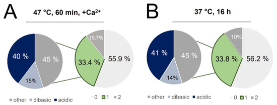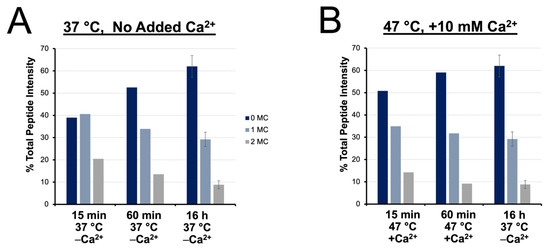 We next provide a quantitative examination of digestion products based on differential dimethyl labeling of various accelerated vs. conventional preparations. Peptides identified from each digestion condition were sorted based on their number of miscleavages and their cumulative signal intensities were plotted over time (Figure 6A,B). Under conventional conditions, longer digestions contribute a significant increase in the frequency of fully cleaved peptides, with a corresponding decrease in the intensity of miscleaved peptides, demonstrating the importance of overnight incubation to maximize cleavage under conventional conditions. At 47 °C with calcium ions present, lengthening the digest from 15 min to 1 h also yields a 10% increase in the intensity of fully cleaved peptides. However, extending the incubation period beyond 1 h does not yield a statistical gain in digestion efficiency.