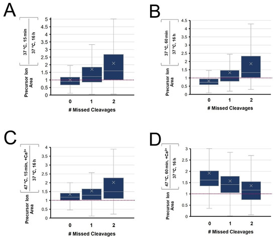 Tukey Box-and-Whisker plots of the distribution of relative peptide peak areas following digestion at (A) 15 or (B) 60 min, each at 37 °C with no added calcium or at 47 °C with 10 mM added calcium for (C) 15 or (D) 60 min. The relative peak intensity is compared to a conventional overnight digest at 37 °C.