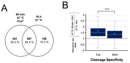 Evaluation of cleavage specificity in the 1 h digest at 47 °C with Ca2+ compared to a conventional overnight digest at 37 °C. (A) Venn diagram of semi-tryptic peptides identified in each digestion condition. (B) Tukey Box-and-Whisker plot comparing peptide quantitation for fully tryptic and semi-tryptic peptides, showing a greater relative abundance of fully tryptic peptides, *** p < 0.001.