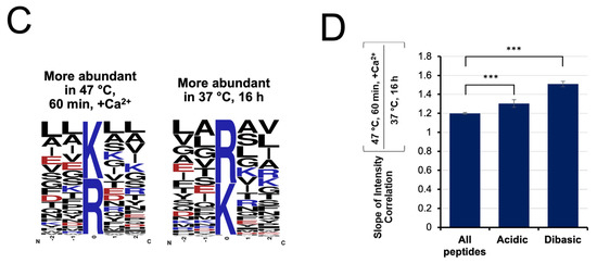 The cleavage efficiency of trypsin varies depending on the nature of the residues proximal to the cut site, with reduced digestion expected for dibasic sites and when K and R residues are adjacent to acidic residues [61,62]. We compared the relative cleavage efficiency of these “hard-to-cut” regions between the enhanced and conventional digests. From Figure 9A,B, it was found that 55% of all miscleaved peptides were contributed by acidic or dibasic cut sites. Based solely on the relative frequencies of miscleavage sites, the motif diagrams in Figure 9C reflect equivalent efficiency for digestion of acidic and basic amino acids within 2 residues or the C-terminal cleavage site. However, a quantitative assessment of these peptides (Figure 9D shows that acidic and dibasic C-terminal digestion sites were cleaved with significantly greater efficiency in the enhanced digest compared to the conventional (p < 0.001). The combination of enhanced cleavage of traditionally difficult sites with a reduction in semi-tryptic peptides lends a conclusion that the accelerated (1 h) incubation at 47 °C with added calcium ions provides an enhanced digestion relative to the conventional overnight (37 °C) approach.