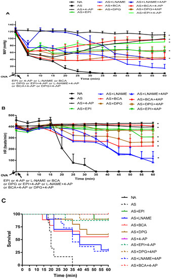 ) administered 1 min after induction of AS in sensitized rats by IV ovalbumin (OVA). MAP and HR were recorded every minute for 60 min post-OVA injection. Values are Mean ± S.E.M. The difference between NA and AS rats was significant (p < 0.0001, two-way analysis of variance, ANOVA) (A,B). The difference observed between AS and all treated groups except AS+ LNAME was significant (p < 0.0001) (A). The differences between AS and single drug treatments (4-AP, BCA, DPG, EPI) and two-drug treatments (BCA+4-AP, DPG+4-AP, EPI+4-AP) were significant (p < 0.0001) with L-NAME (p < 0.01) (B,C) Survival for each group, NA
