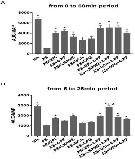 AUC-MAP was calculated over 60 min (Figure 2A), from 5 to 25 min (Figure 2B) and from 25 to 60 min (Figure 2C). AUC-MAP for the entire 60 min experimental period (Figure 2A) was lower in AS than NA groups (p ˂ 0.0001). AUC-MAP of the EPI, 4-AP, and L-NAME groups was higher than for AS group (p ˂ 0.002, p ˂ 0.0004, p ˂ 0.04 respectively). BCA and DPG treatments did not affect AUC-MAP. Combined treatments showed higher AUC-MAP than for AS group (p ˂ 0.0001 for AS vs. AS+EPI+4-AP, vs. AS+L-NAME+4-AP, vs. AS+BCA+4-AP; p ˂ 0.003 vs. AS+DPG+4-AP).