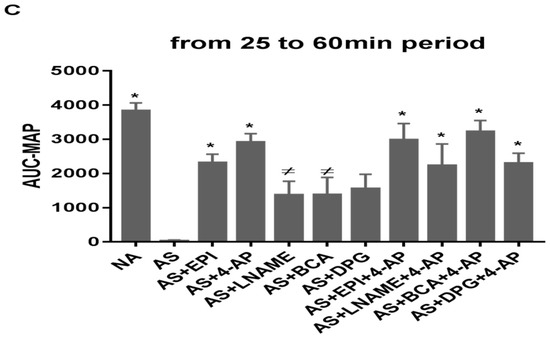 Between 25 min and 60 min (Figure 2C), AUC-MAP was lower in AS than in NA groups (p ˂ 0.0001). EPI and 4-AP treatments increased AUC-MAP vs. AS group (p ˂ 0.003 and p ˂ 0.0001, respectively). L-NAME, BCA, and DPG did not affect AUC-MAP. Combined 4-AP treatment AUC-MAP values exceeded those of AS group (p ˂ 0.0002 vs. AS+EPI+4-AP, p ˂ 0.005 vs. AS+L-NAME+4-AP, p ˂ 0.0001 vs. AS+BCA+4-AP p ˂ 0.003 vs. AS+DPG+4-AP).
