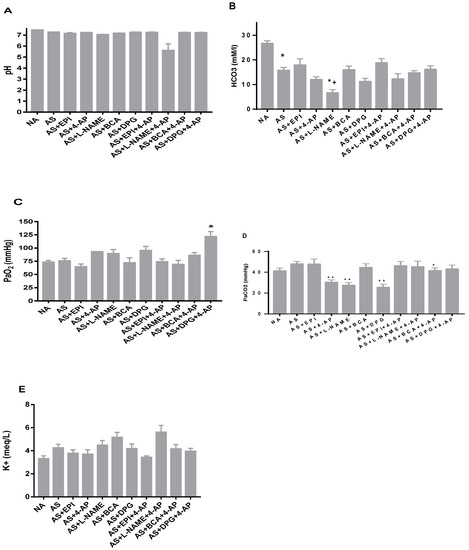 The AS group exhibited severe metabolic acidosis ([HCO3–] 15.7 ± 1.24 mM and pH 7.2 ± 0.03), reflecting AS-associated tissue hypoperfusion (Figure 3A,B). AS-induced metabolic acidosis was not rescued by any tested treatment (Figure 3A). However, L-NAME further exacerbated metabolic acidosis (Figure 3A) and lowered serum [HCO3-] (p ˂ 0.01 vs. untreated AS) (Figure 3B). PaO2 was elevated by combined treatment with DPG+4-AP but was unchanged with other treatments (Figure 3C). PaCO2 was lower in rats treated with LNAME, DPG and 4-AP as compared to untreated rats (Figure 3E, p < 0.001). Serum K+ was unchanged by any treatments (Figure 3D).