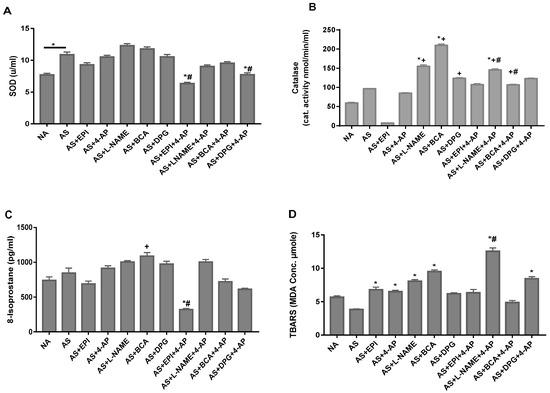 NA and AS rat arterial blood levels of the oxidative stress markers, superoxide dismutase (SOD) (A), catalase (B), 8-isoprostane (C), and thiobarbituric acid-reactive substances (TBARS) (D) after OVA injection in non-allergic (NA) and allergic rats (AS), followed 1 min afterwards with injection of EPI, L-NAME, BCA, DPG, or 4-AP, or (in rats treated with 4-AP drug combinations) L-NAME+4-AP, BCA+4-AP, DPG+4-AP or EPI+4-AP. Values are Mean ± S.E.M; * p < 0.05 vs. AS group, + p < 0.05 vs. EPI group, # p < 0.05 vs. 4-AP group. NA, non-allergic rats; AS, allergic rats; BCA, β-cyanoalanine; DPG, dl-propargylglycine; L-NAME, L-NG-Nitroarginine methyl ester; 4-AP, 4-aminopyridine; EPI, epinephrine. BCA+4-AP, β-cyanoalanine+4-aminopyridine; DPG+4-AP, dl-propargylglycine+4-aminopyridine; L-NAME+4-AP, L-NG-Nitroarginine methyl ester+4-aminopyridine; EPI+4-AP, epinephrine+4-aminopyridine.