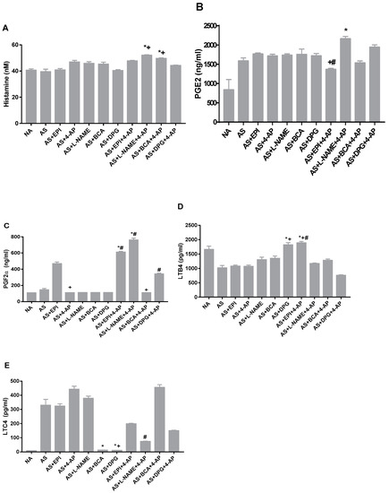 AS arterial plasma concentrations of the allergic and inflammatory mediators histamine (A), prostaglandin E2 (PGE2) (B), prostaglandin F2α (PGF2α) (C), leukotriene B4 (LTB4) (D), and leukotriene C4 (LTC4) (E) after OVA injection in untreated AS rats, rats treated with EPI, L-NAME, DPG, BCA,4-AP or EPI, and rats treated with the 4-AP drug combinations with L-NAME+4-AP, BCA+4-AP, DPG+4-AP or EPI+4-AP. Values are Mean ± S.E.M; * p < 0.05 vs. AS group; + p < 0.05 vs. EPI group; # p< 0.05 vs. 4-AP group. NA, non-allergic rats; AS, allergic rats; BCA, β-cyanoalanine; DPG, dl-propargylglycine; L-NAME, L-NG-Nitroarginine methyl ester; 4-AP, 4-aminopyridine; EPI, epinephrine. BCA+4-AP, β-cyanoalanine+4-aminopyridine; DPG+4-AP, dl-propargylglycine+4-aminopyridine; L-NAME+4-AP, L-NG-Nitroarginine methyl ester+4-aminopyridine; EPI+4-AP, epinephrine+4-aminopyridine.