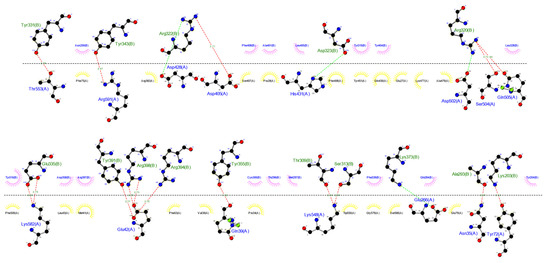 - Wallace, A.C.; Laskowski, R.A.; Thornton, J.M. LIGPLOT: A program to generate schematic diagrams of protein-ligand interactions. Protein Eng. Des. Sel. 1995, 8, 127–134. [Google Scholar] [CrossRef] [PubMed]