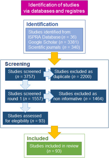 A systematic review was carried out to collect all the available information and data on Portunus segnis necessary to describe the distribution, aggregation patterns, and spatial structure of this species in the Mediterranean Sea and Suez Canal. The systematic review was carried out according to the orientations of Preferred Reporting Items for Systematic Reviews and Meta-Analyses (PRISMA) [17]. Literature from the ISPRA Database of marine alien species in the Mediterranean Sea, used to build the atlas “Atlante delle specie non indigene nei mari italiani e nel Mediterraneo” (updated to 2011) [18] was a valid starting point for the review. This reference list was then updated with other studies identified using Google Scholar (scholar.google.com) freely accessible web search engine of academic articles (accessed up to December 2021), as well as consulting the online archives of the main scientific journals that publish studies on bioinvasion topics.