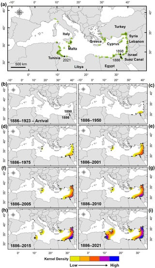Distribution of Portunus segnis in the Mediterranean Sea together with the Kernel density cumulative maps. (a) The overall distribution of the selected records; (b–i) Period–to–period variation in space and time of P. segnis occurrence in Mediterranean Sea, (b) 1886–1923 period corresponding to the arrival phase of P. segnis. The first record in the Suez Canal in 1886 and the first record in the Mediterranean in 1898 are reported. (c–e) 1886–1950, 1886–1975, 1886–2001 periods. (d–i) 1886–2005, 1886–2010, 1886–2015, 1886–2021 periods. The triangles and the circles in (a–i) indicate the records of P. segnis in the Mediterranean Sea. First record in Suez Canal (1886) and in the Mediterranean Sea (1898), and the last record in Libya (2021) are also reported in (a) (circles).