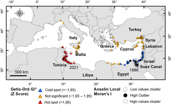 Figure 4 provides an overview of the clusters and outliers analyses (AMI) and hotspots (GOG*). At local scale, the coasts of the eastern basin show a statistically significant clustering of low values and a cold spot on the Egyptian–Israeli coast, and another low-values cluster in Turkey (near Syria), corresponding to the older records of P. segnis in the Mediterranean Sea. A high value cluster and a hot spot were found in Tunisia, corresponding to the most recent records. Outliers of high value were found in the Suez Canal and in Egypt. The other records have non–significant GOG* and AMI values.