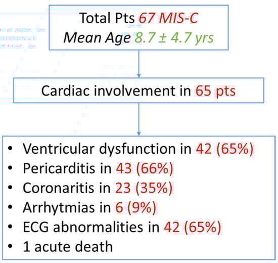 Among them, during the acute event, 42 patients (65%) had ventricular dysfunction, 43 (66%) of them presented with pericarditis, 23 patients (35%) had a coronary involvement, and ECG abnormalities were observed in 42 patients (65%), and six children (9%) showed arrhythmias. One patient died of an acute respiratory failure and cardiogenic shock in the first 24 h of their hospitalization (Figure 1).